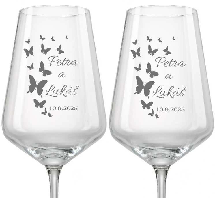 Sada 2 svatebních sklenek na víno Sandra-350 s ručně pískovanými motýly, jmény a datem svatby.