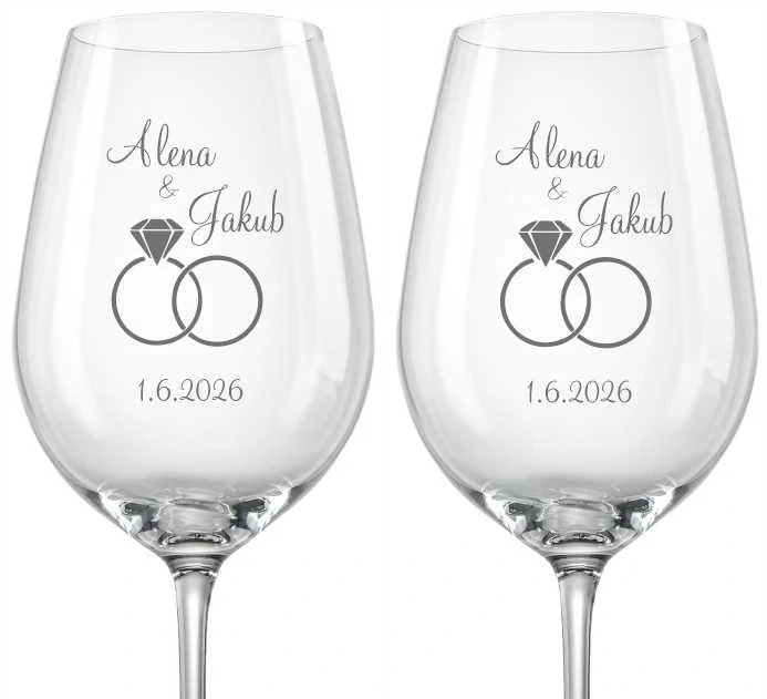 Sada 2 svatebních sklenek na víno Viola-350-ml s ručně pískovanými prsteny, jmény a datem svatby.