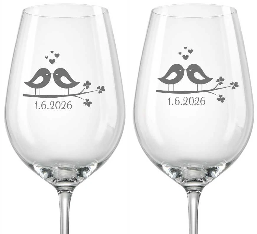 Sada 2 svatebních sklenek na víno Viola-350-ml s ručně pískovanými ptáčky a datem svatby.