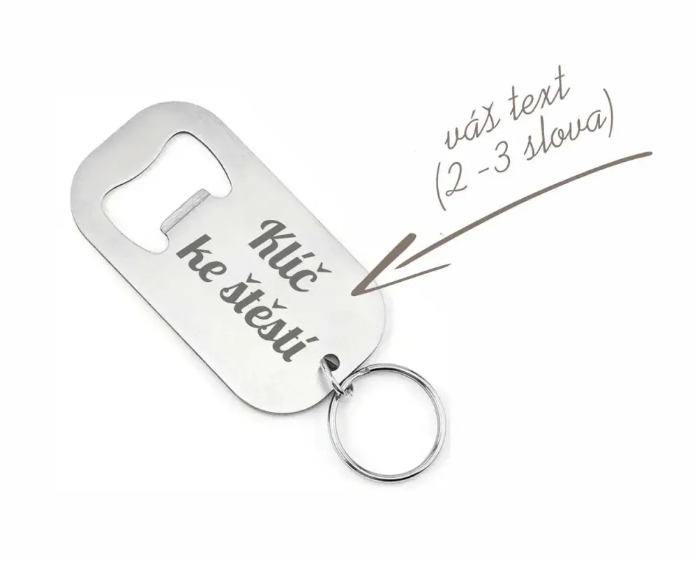 Kovová klíčenka/otvírák s personalizovaným pískovaným textem.