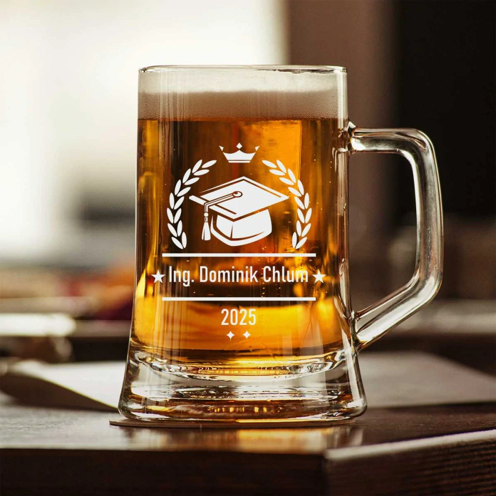 Půllitr Pub s ručně pískovaným motivem jménem rokem promoce. Technika pískování je nesmyvatelná, obdobná jako klasické broušení.