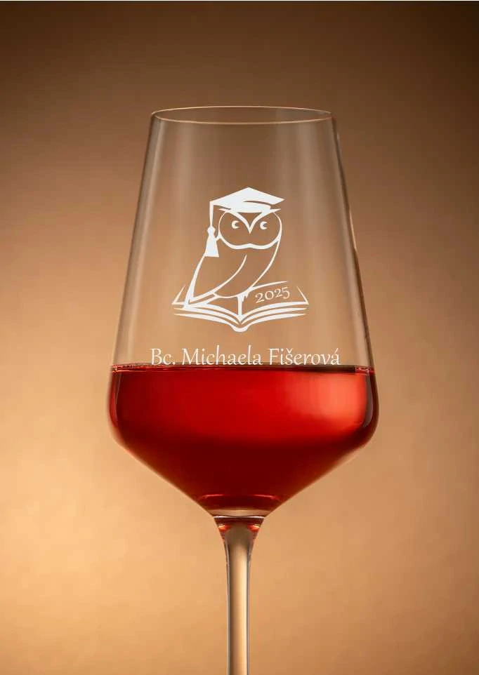 Sklenka na víno s pískovaným motivem sovy jménem a rokem.