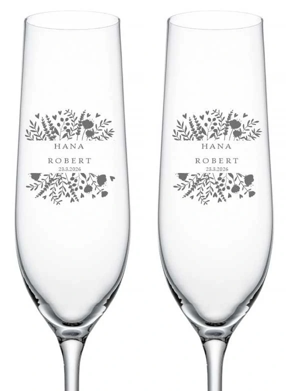 Sada 2 svatebních sklenek Viola na sekt s ručně pískovanými květinami, jmény a datem svatby.