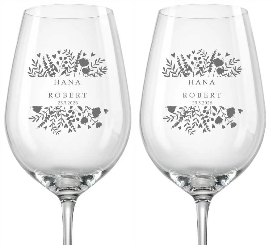Sada 2 svatebních sklenek na víno Viola s ručně pískovanými květinami, jmény a datem svatby.